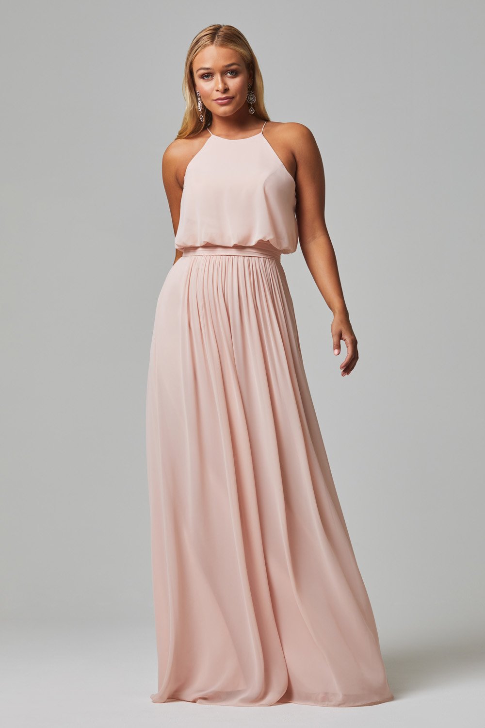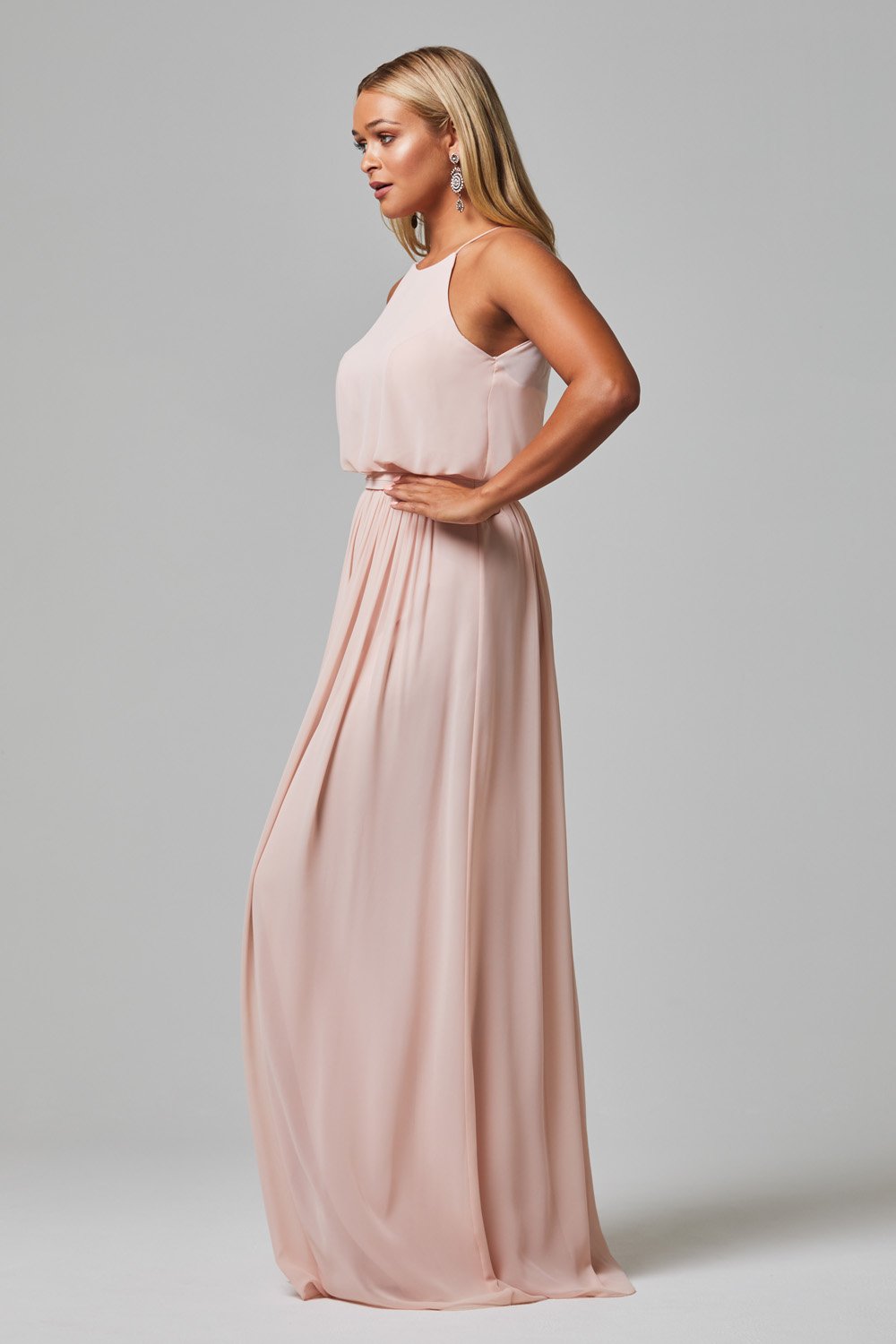 The Sylvia gown in Pink features a delicate spaghetti halter neck and a floating bodice over a floor-length georgette skirt. This design offers a romantic and airy look for any bridal party.